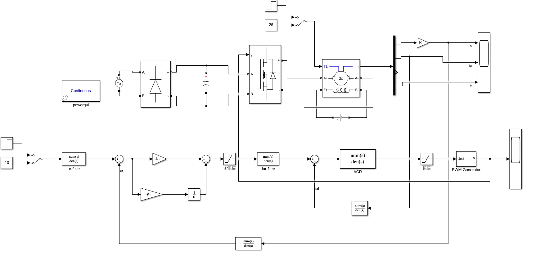直流电机双闭环(电流环、转速环)调速系统:可以根据给定调节电机转速,同时也可以在负载或电网电压发生变动的时候保持电机转速不变。 包含仿真和设计报告 设计报告有详细的主电路和控制电路等的设计过程和参数选取